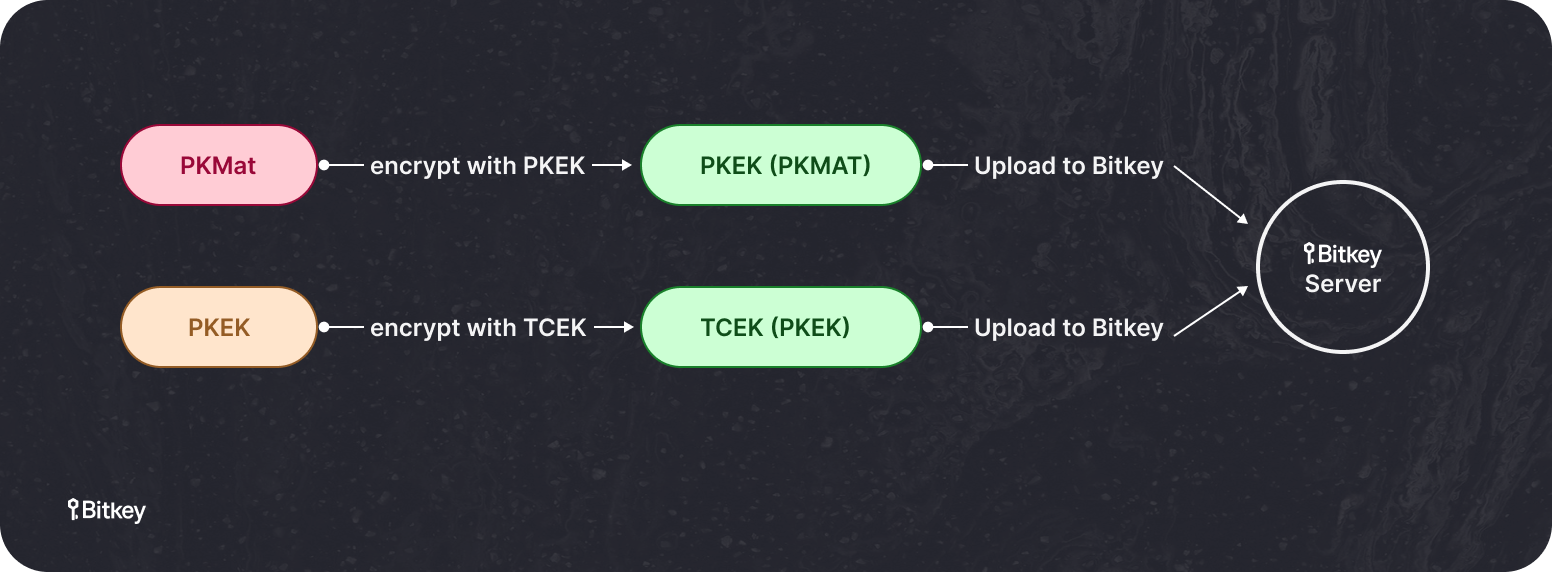 To ensure the benefactor’s private key material (PKMat) is never accessible to Bitkey’s servers, the benefactor first encrypts it with a Private Key Encryption Key (PKEK) on their app. Once the private key material key is encrypted, it is safe to upload to Bitkey’s server–an arrangement that also prevents your beneficiary from having access to this key until inheritance is completed.